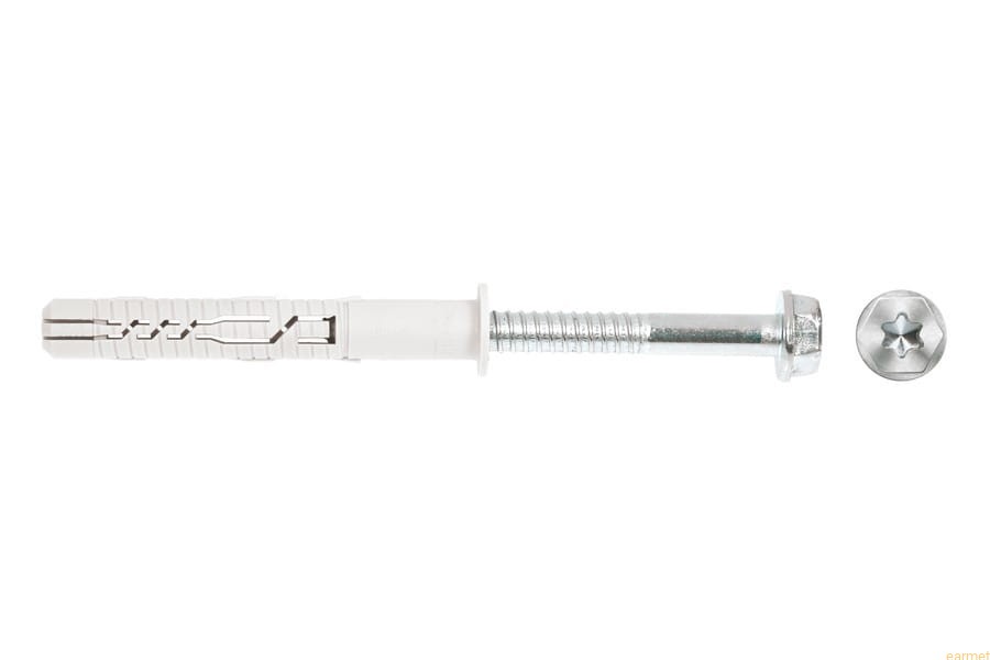 Kołek ramowy rozporowy tworzywowy ze wkrętem z łbem sześciokątnym i gniazdem TX do montażu poprzez element mocowany do wszystkich klas podłoży.
