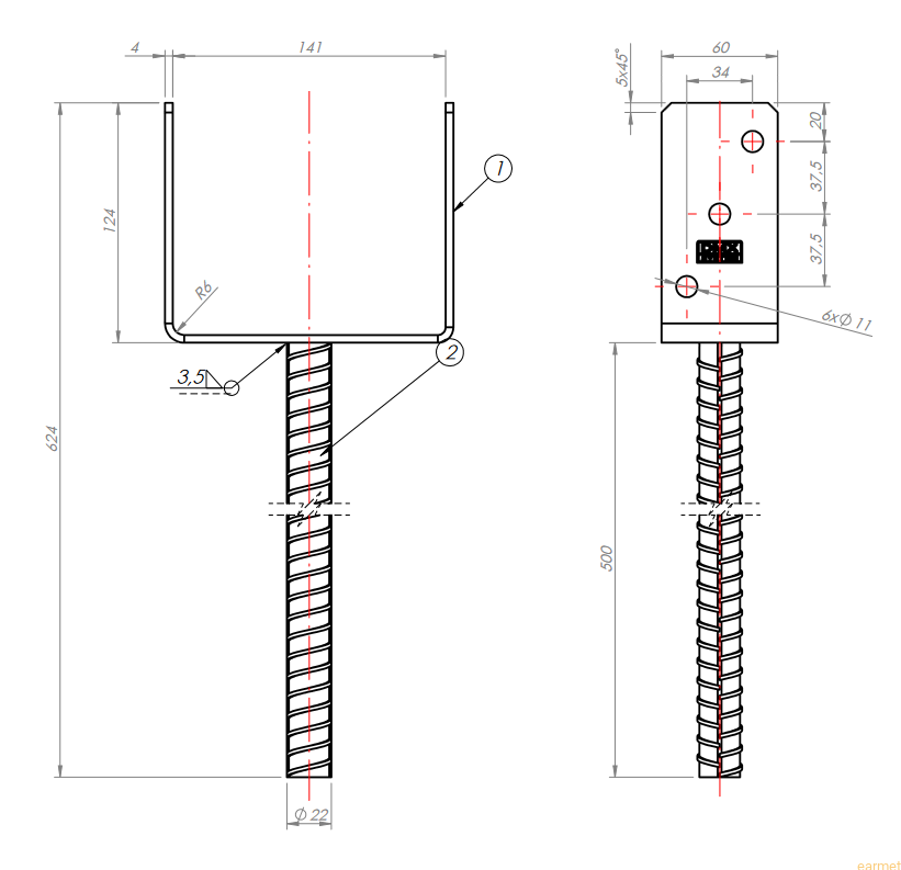 Podstawa słupa PS 140U/500 / 141x624x124x4,0 z wydłużonym prętem do wmurowania