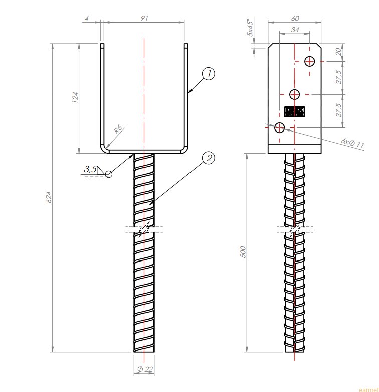 Podstawa słupa PS 90U/500 / 91x624x124x4,0 z wydłużonym prętem do wmurowania
